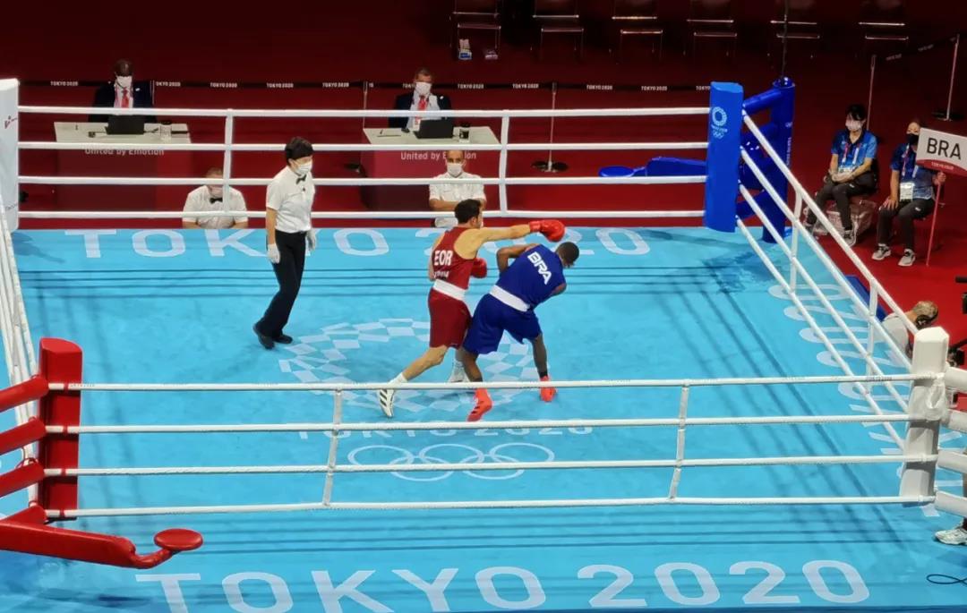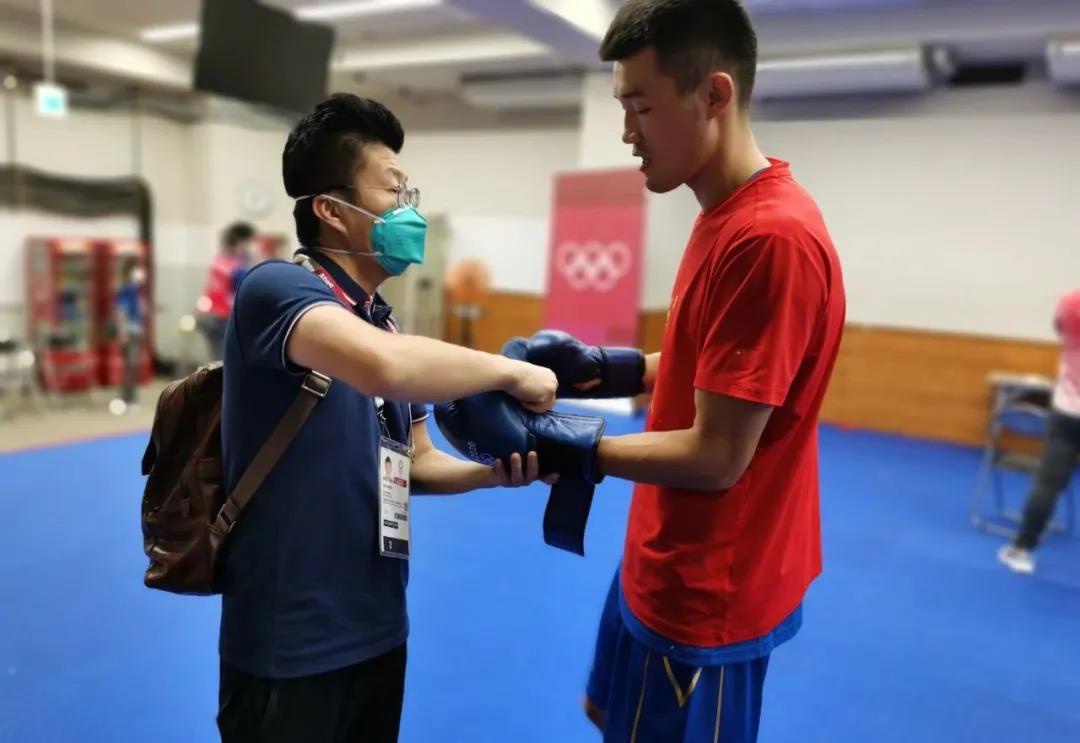 东京奥运会拳击热身馆,世界杯官方网页版工作人员帮助运动员穿戴拳击手套