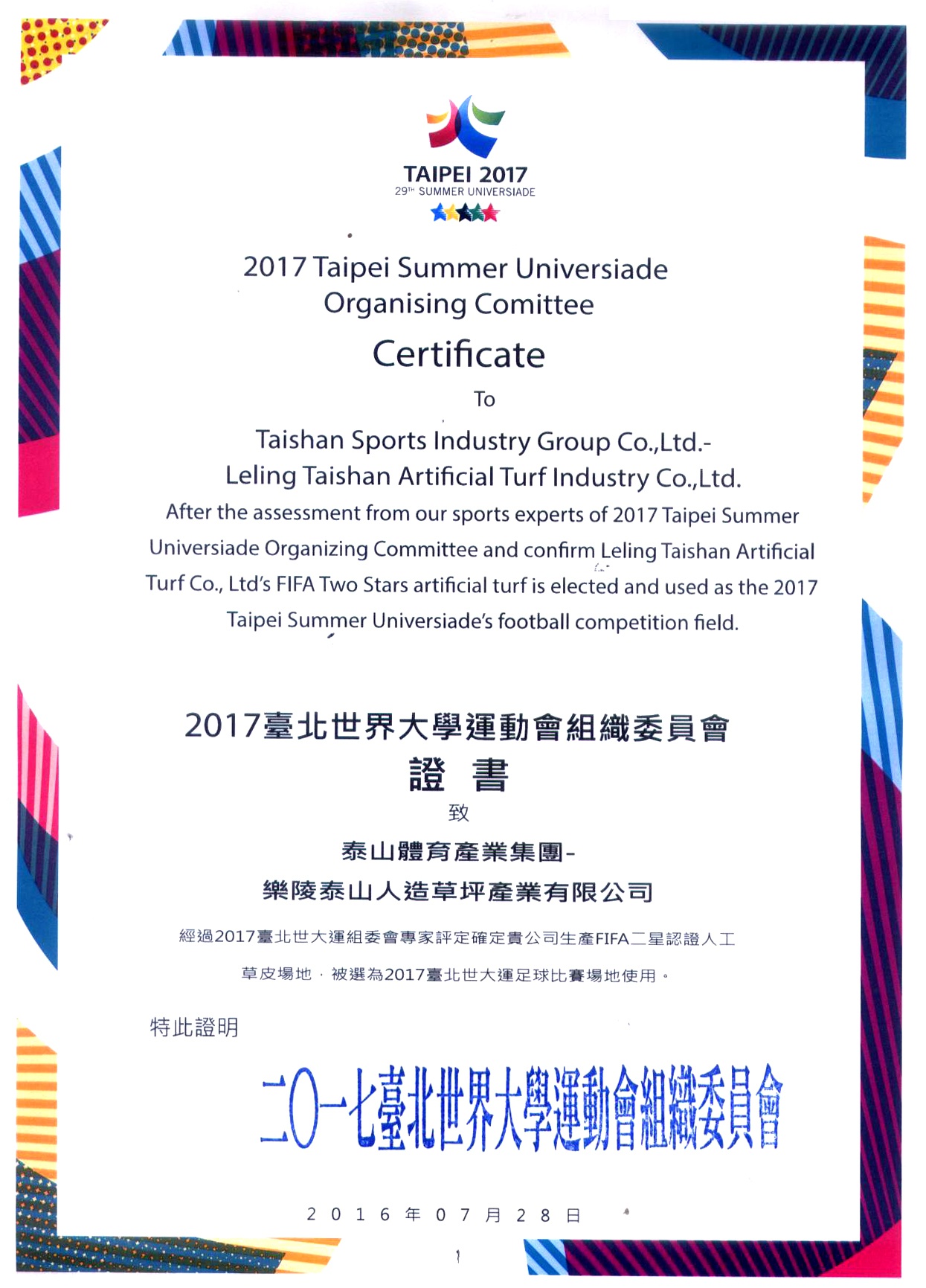 2017台北世界大学运动会组织委员会证书致乐陵泰山人造草坪产业有限公司